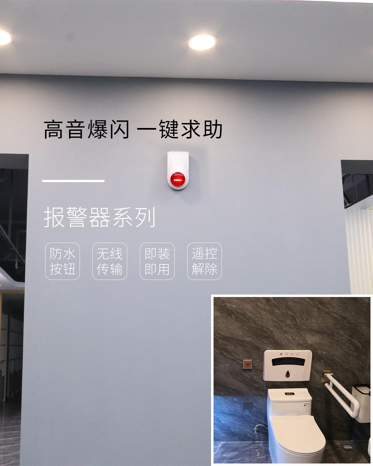 H1說明:第三衛(wèi)生間或殘疾人坑位緊急求助(無線傳輸),本地聲光報(bào)警,電池供電,433MHZ無線數(shù)據(jù)傳輸,防水外殼,2000次以上按鍵求助,外形尺寸86*86*13,網(wǎng)關(guān)同步顯示對(duì)應(yīng)位置。