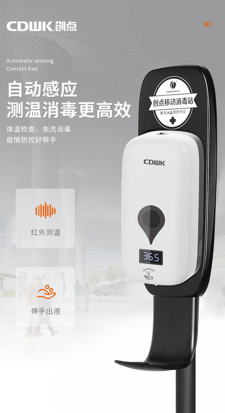 其移動消毒站專為解決公共場所健康監測、清潔消毒難題而來。整體外形基于簡約美學而開發,黑白干凈的配色,讓整體機身給使用者帶來更加清爽整潔的視覺感受,更加融合了它極簡的設計理念。產品設置了紅外線傳感器,用戶把手放置感應區域,皂液器就可自動出泡,降低了可能傳播細菌和病毒的風險,衛生又干凈,打造看得見的安全感,同時能有效控制浪費現象,實現便捷測溫,滿足酒店業高效、便捷、節能的衛生清潔需求。